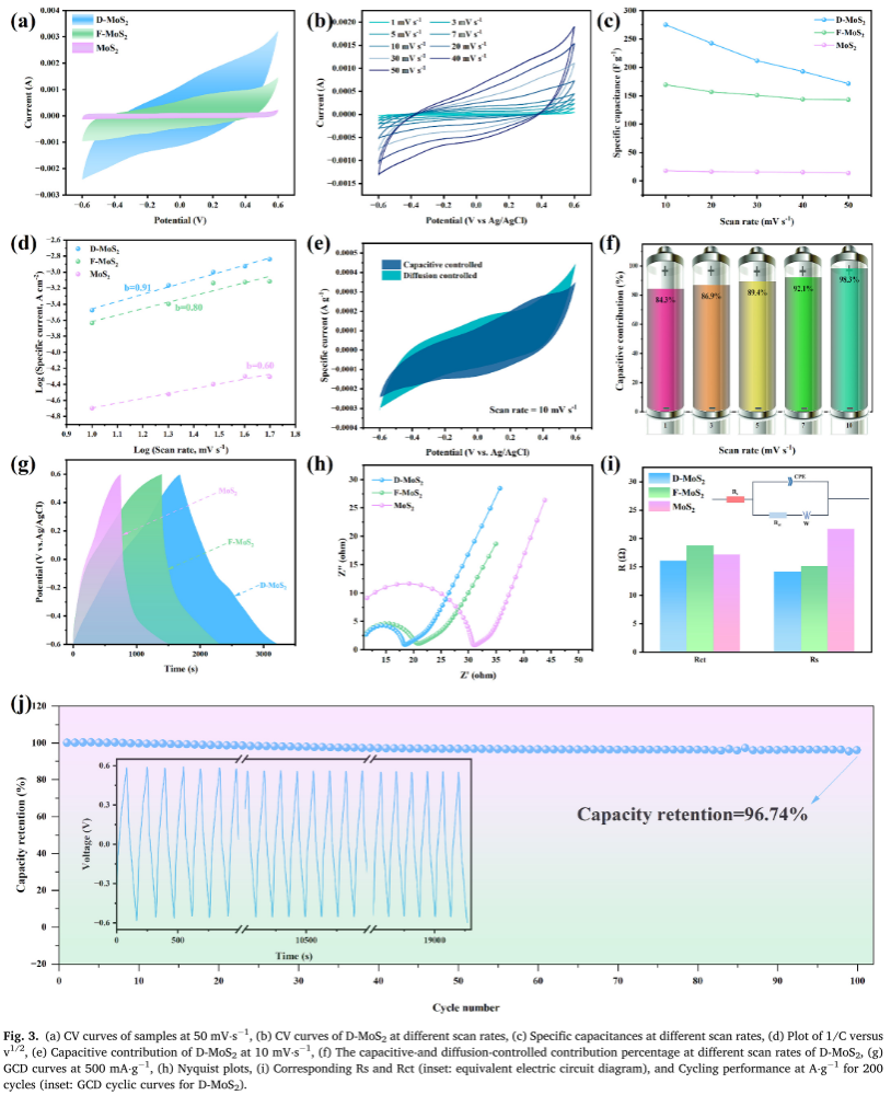 D-MoS2在10 mV·s-1比电容达275.16 F·g-1,b=0.91,10 mV·s-1电容贡献84.3%,GCD近三角形体现优良可逆赝电容行为。EIS显示低Rs/Rct(14.13/16.12 Ω)与更大低频斜率,等效电路拟合与Warburg关系共同指向更快离子扩散和更佳电荷传输。