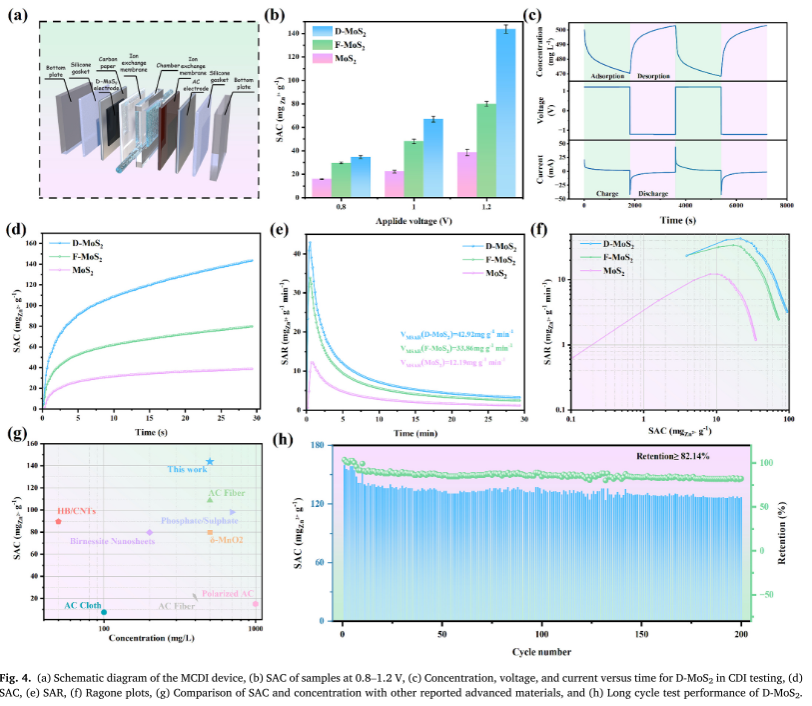 在0.8–1.2 V均优于对照;1.2 V兼顾抑制>1.23 V析水与提升效率。D-MoS2的SAC达143.84 mg·g-1(1.2 V),SAR初始峰值42.92 mg·g-1·min-1、平均4.79;Ragone右移表征高功率-容量协同。能耗最低1.52 kWh·kg-1(500 mg·L-1),充电效率可达119.95%;200次循环仍保留82.14% SAC,稳定耐久。