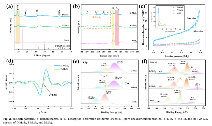 XRD(002)由9.02°→8.71°显著左移,证实层间扩展;Raman出现J1–J3峰并伴随E12g红移/展宽,指向1T增强与Mo–S键弱化。N₂吸脱表明介/微孔并存,比表面积升至16.94 m2·g-1,源于空化致孔;EPR g≈2.003与ICP共同量化S空位,F-MoS₂为11.79%,D-MoS₂达14.87%,显著提升活性位与润湿性。