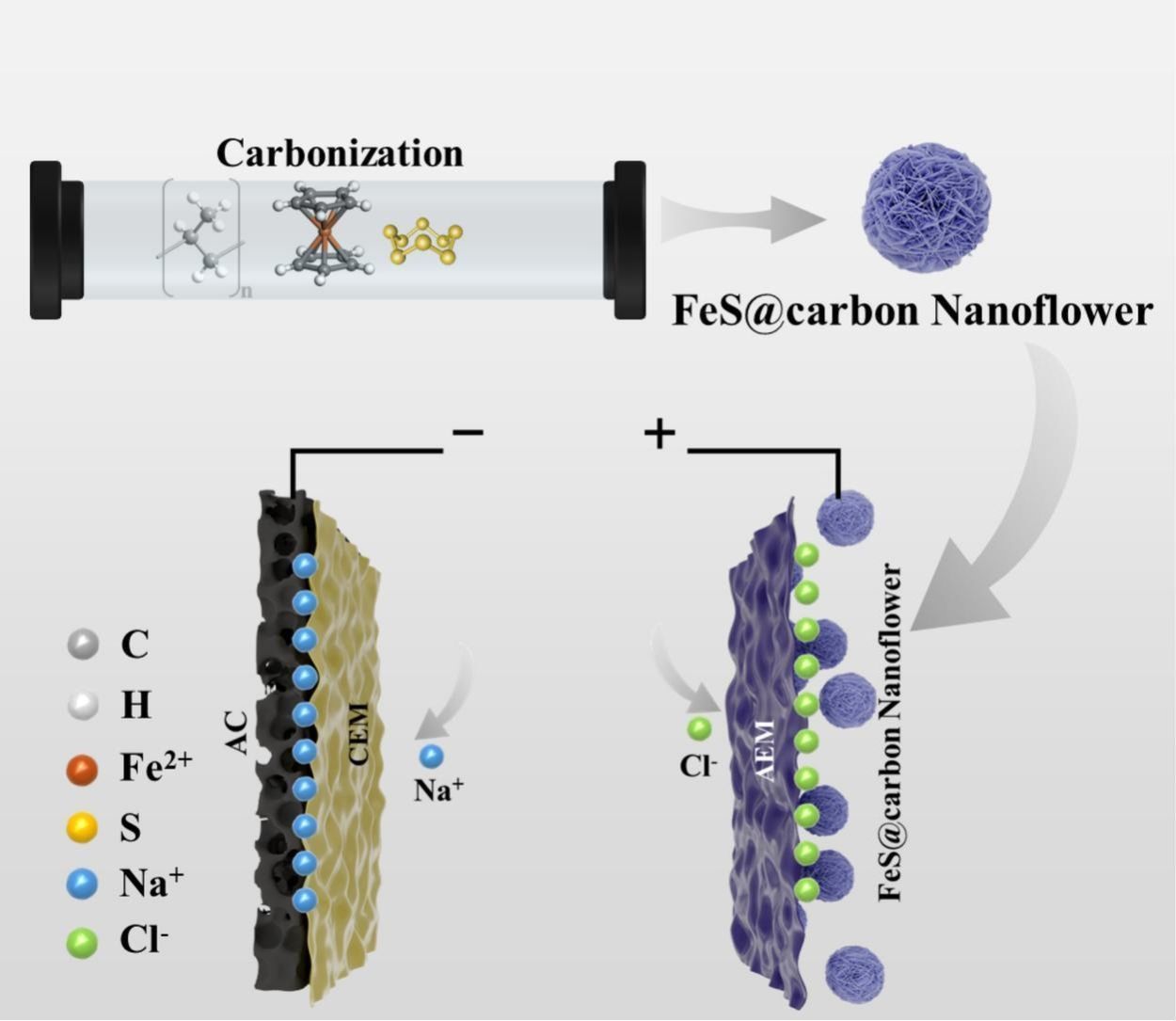 C、 FeS@碳纳米花展现出高达64.67 mg g⁻¹的优异脱盐能力,以及容量保持率超过90%的良好循环稳定性。