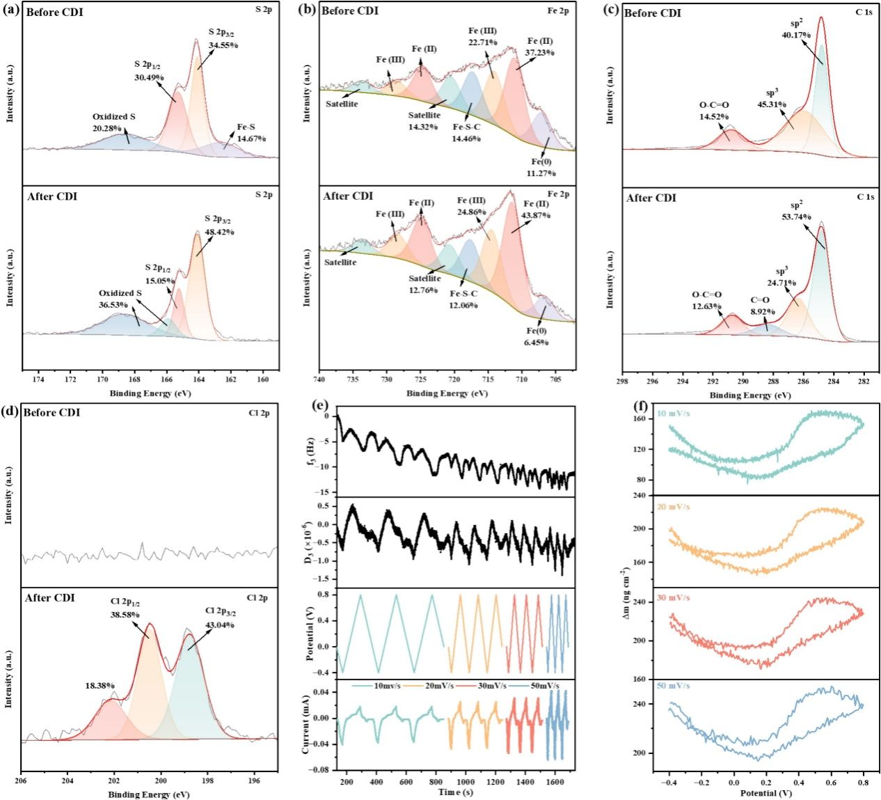 本研究结合非原位表征与原位技术深入揭示了除氯机理。图4(a-d)的XPS光谱分析证实了电化学过程中的化学变化:吸附后 S 2p谱中Fe-S键特征峰消失且氧化态硫含量显著增加,同时Fe 2p谱显示Fe³⁺比例上升,表明Fe-S键断裂及Fe⟡⁺/Fe³⁺的可逆氧化还原反应提供了电子补偿以增强对Cl⁻的静电吸附。为了进一步阐明微观层面的质量传输机制,研究采用了原位EQCM-D技术作为“质量探针”。图4(e)展示了频率(f3)和耗散因子(D3)随电位扫描的实时响应。数据显示,当扫描速率大于或等于20 mV s⁻¹时,f3和D3均呈现出良好的周期性变化,且与CV曲线的峰值变化高度吻合,这表明PFS-2电极的质量和粘弹性质的变化是高度可逆的。具体而言,在0 V至-0.4 V的充电过程中,f3的下降指示电极质量增加,对应离子的扩散嵌入;而在-0.4 V至0 V的放电过程中,f3的变化趋势反转并恢复至初始值,证实了离子嵌入与脱出的可逆性。图4(f)进一步通过计算电极质量变化(Δm)详细解析了离子交换顺序:在还原过程初期(-0.4 V至0 V),观察到电极质量出现负变化,指示发生了Na⁺的脱附;随着还原反应的进行(0 V至0.8 V),电极质量转为正增长,表明发生了Cl⁻的吸附。反之,在氧化过程(0.8 V至-0.4 V)中,观察到相反的质量变化模式(先减小后增加),对应于Cl⁻的脱附和随后的Na⁺吸附。这一结果直接证实了在该电极表面,Na⁺的脱附优先发生,随后伴随Cl⁻的吸附,从而清晰地描绘了具体的除氯微观动力学路径。