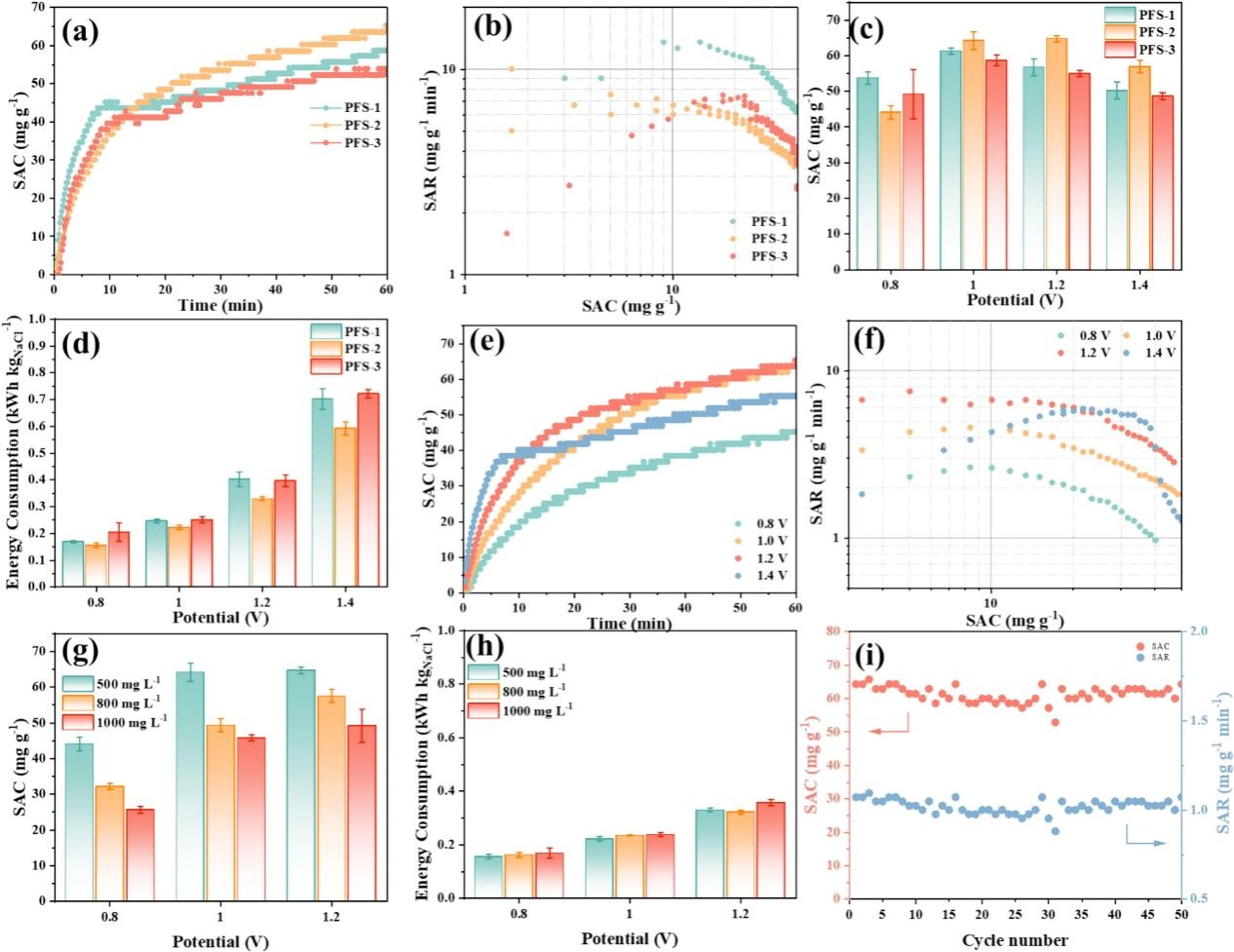 在脱盐测试中,FeS@碳纳米花展现出卓越的性能。图3(a)的吸附动力学曲线显示,PFS-2电极在1.2 V电压下的盐吸附容量(SAC)高达64.47 mg g⁻¹(最高达65.31 mg g⁻¹),且吸附速率快,显著优于其他对比样品。图3(c-d)对比了不同截止电压下的平均SAC及能耗,结果表明1.2 V是平衡吸附容量与能效的最佳工作电压。当电压进一步升至1.4 V时,图3(e)显示其SAC反而因副反应和表面胶体的形成而下降。此外,图3(g)探究了不同初始浓度对吸附性能的影响,证实材料在宽浓度范围内均保持良好的除盐能力。更为重要的是,图3(i)的长循环测试结果表明,经过50次吸附-解吸循环后,PFS-2的容量保持率超过90%,证明该电极材料具有极佳的结构稳定性和再生能力。