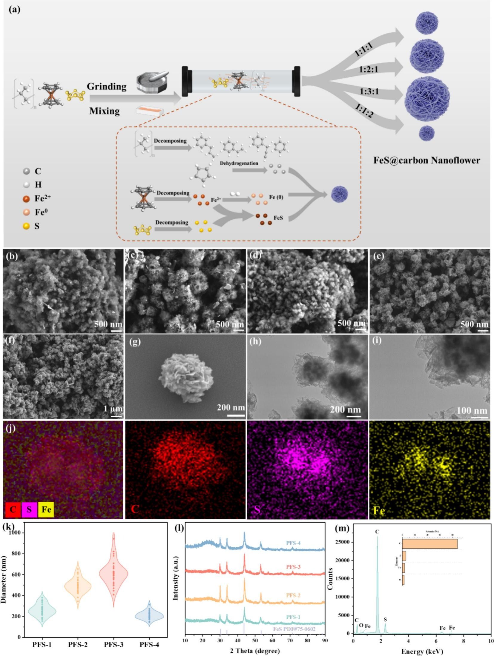 本研究通过巧妙的“一锅法”策略实现了废塑料的高值化利用,图1(a)展示了FeS@碳纳米花的制备流程示意图:聚丙烯(PP)、二茂铁和升华硫经研磨混合后,在高温下通过原位催化碳化直接转化为功能材料。SEM图像揭示了催化剂配比对材料形貌的显著调控作用,图1(b-d)分别显示了不同配比(PFS-1, PFS-3, PFS-4)样品的微观形貌,结果表明二茂铁含量的增加会促进铁原子团聚从而增大纳米花尺寸,而硫含量的增加则有助于形成更细小的致密团簇。在优化比例(1:2:1)下,图1(e-g)清晰地呈现出由碳纳米片组装而成的三维花状簇结构(PFS-2),这种结构具有丰富的孔隙。进一步观察微观结构,图1(h-i)的TEM图像证实了FeS纳米颗粒被均匀包裹在碳骨架内部,且图1(j)的EDS元素分布图显示C、S、Fe三种元素分布高度均匀,证明了原位合成的成功。此外,图1(k)的小提琴图定量统计了碳纳米花的粒径分布,而图1(m)的XRD图谱则确认了FeS高结晶度物相的形成,这些结构特征共同为优异的电化学性能奠定了基础。