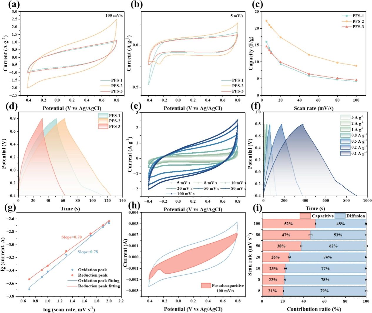 为了探究材料的电化学特性,研究对比了不同样品的储能表现。图2(a-b)显示在不同扫速下,PFS-2电极的CV曲线积分面积最大,且在低扫速下出现明显的氧化还原峰,暗示了法拉第反应的存在。图2(c)的比电容变化曲线进一步证实PFS-2在所有测试倍率下均具有最高的比电容。动力学分析方面,图2(g)通过拟合峰值电流与扫速的对数关系,得出氧化峰和还原峰的b值分别为0.78和0.70,表明储能机制是由表面电容行为和扩散控制行为共同主导的混合模式。为了量化这一贡献,图2(h)区分了100 mV s⁻¹下的电容贡献与扩散贡献,图2(i)则直观展示了随着扫速增加,电容控制的贡献率逐渐占据主导地位,这得益于FeS提供的赝电容活性位点以及硫掺杂碳骨架带来的快速电子传输能力。