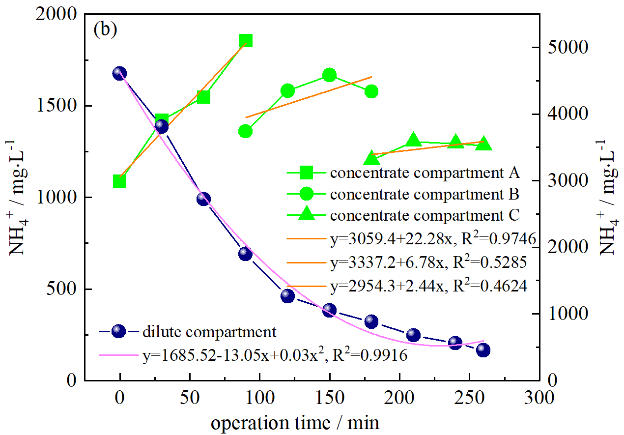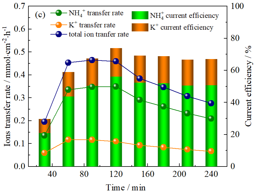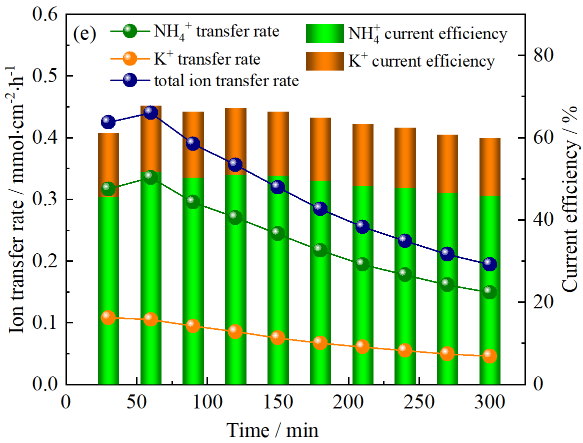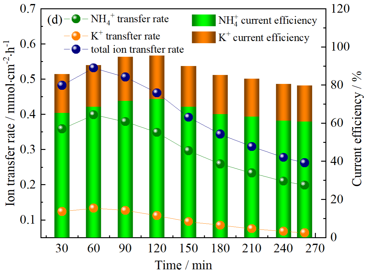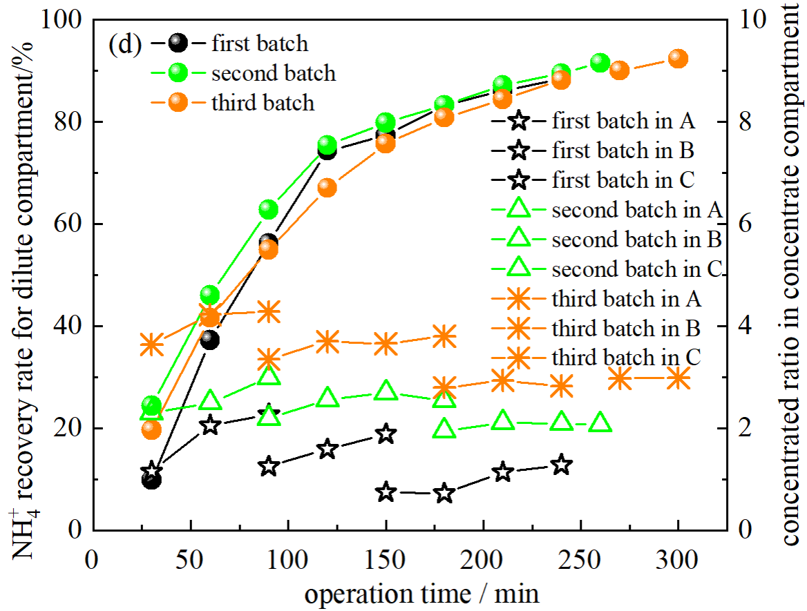 图3-5展示ED系统对氮、钾离子的迁移与回收动力学。研究表明,采用三级浓缩槽设计的ED系统能有效从DUFM透过液中迁移NH4+和K+。经过多批次运行,NH4+和K+的回收率均超过90%,并在A级浓缩槽中分别富集至约6450 mg·L-1和6050 mg·L-1的高浓度,满足制备液体肥料的要求。