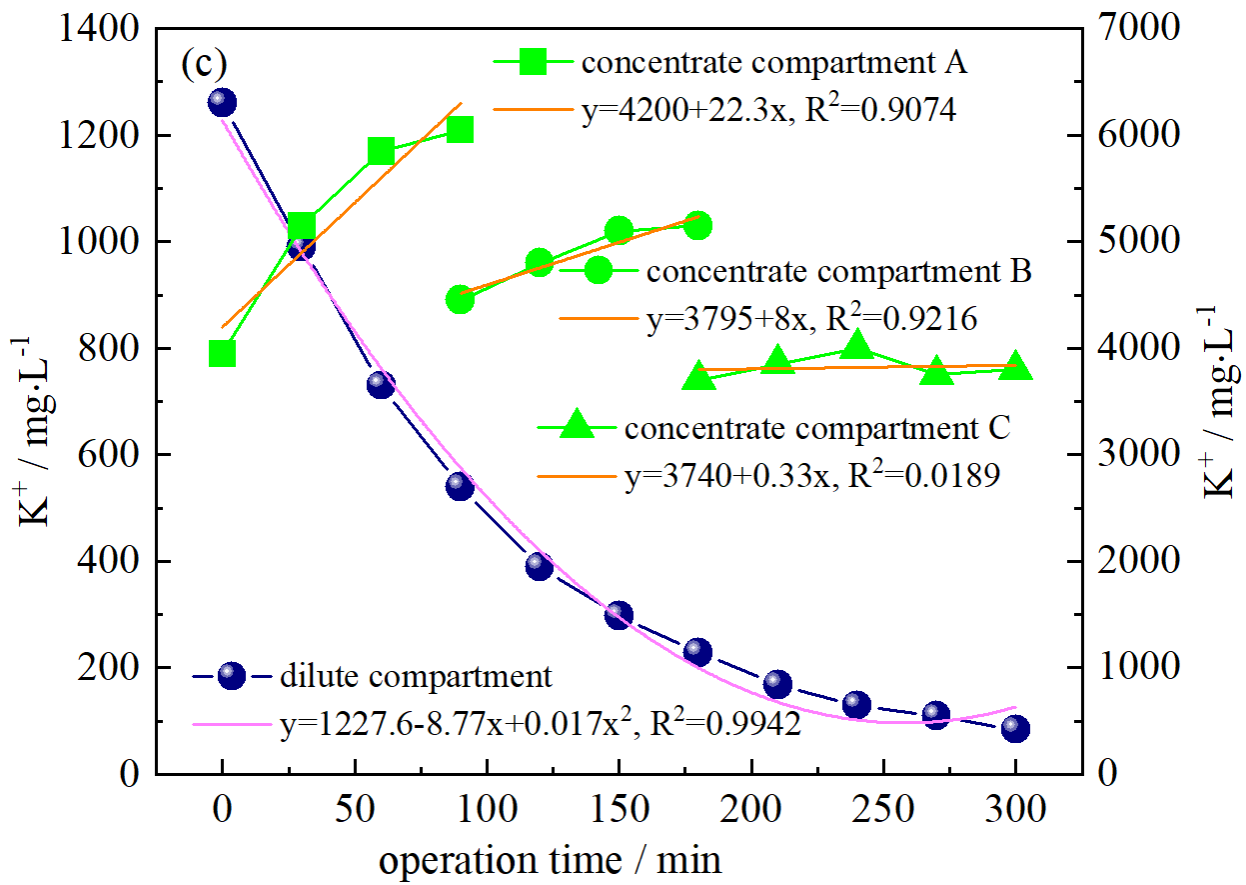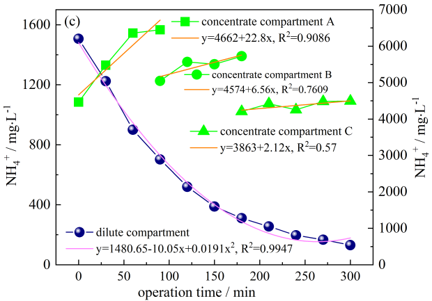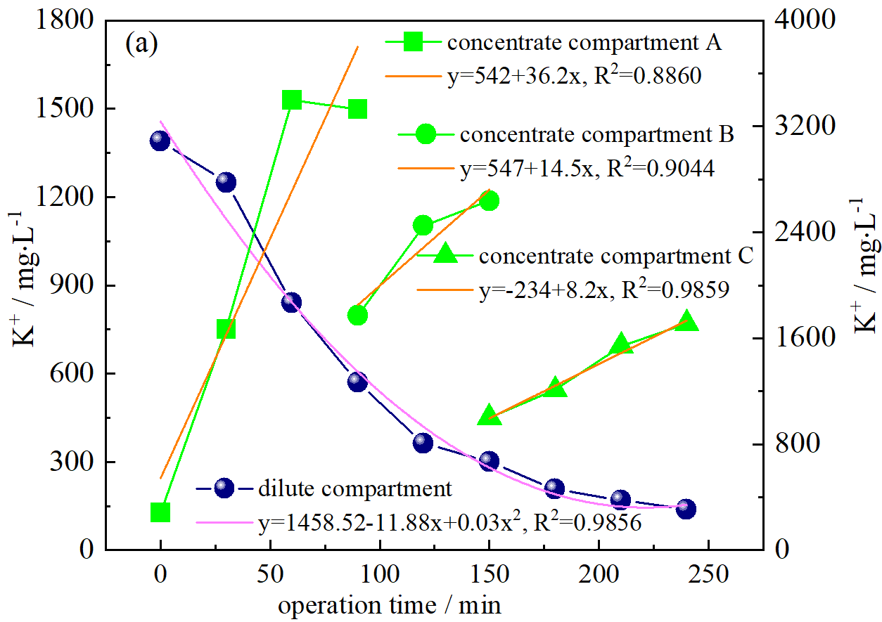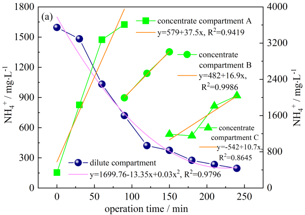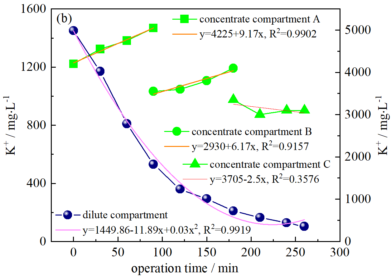 图3-5展示ED系统对氮、钾离子的迁移与回收动力学。研究表明,采用三级浓缩槽设计的ED系统能有效从DUFM透过液中迁移NH4+和K+。经过多批次运行,NH4+和K+的回收率均超过90%,并在A级浓缩槽中分别富集至约6450 mg·L-1和6050 mg·L-1的高浓度,满足制备液体肥料的要求。
