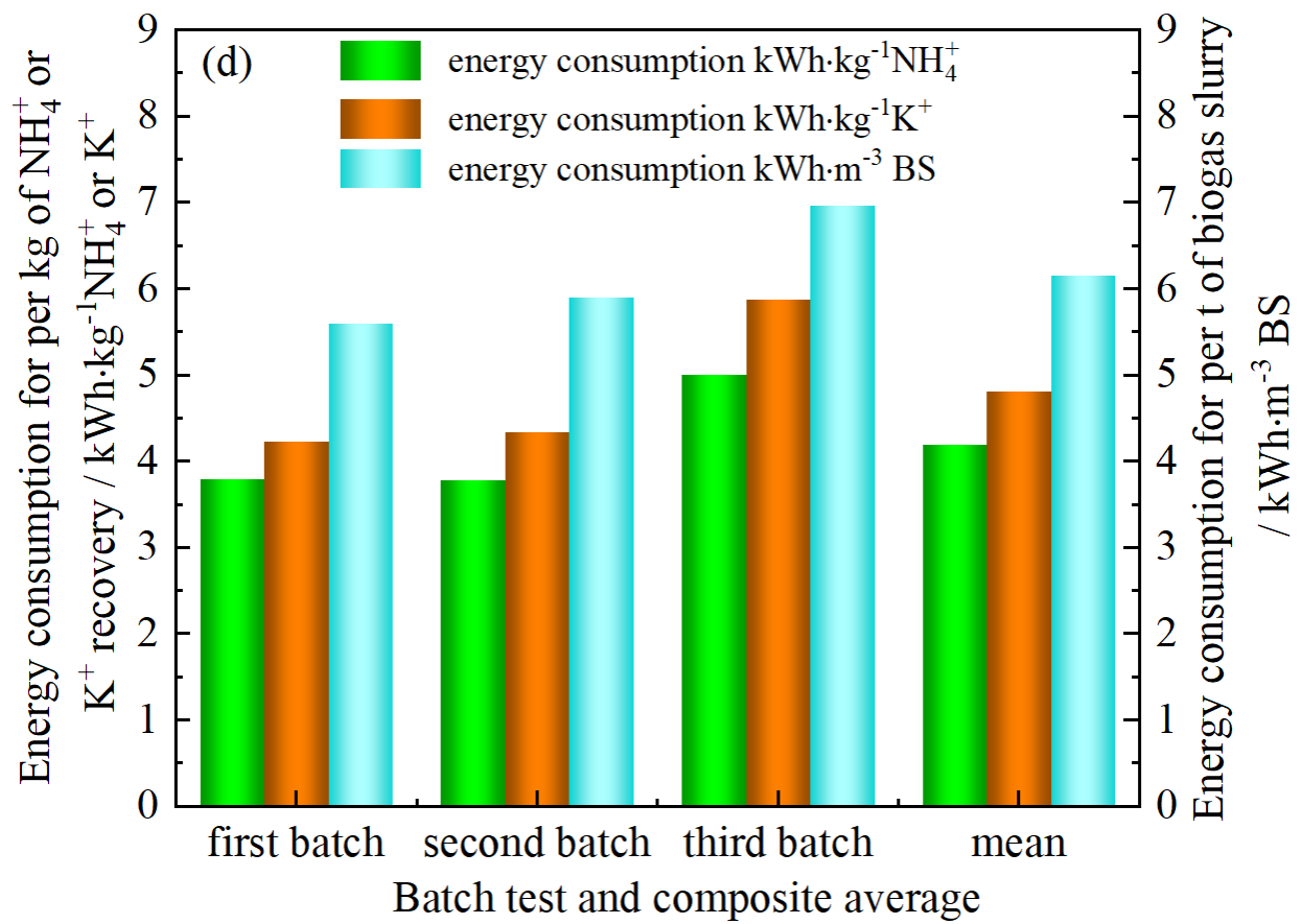 Fig. 7.DUFMenergy consumption overtimein different batch testsunder 5-7 bar operating pressure (a-b); ED specific energy consumptionovertimeindifferent batchtests (c);energy consumption per kilogramof recoveredNH4+or K+,andper cubicmeter of BS (d).