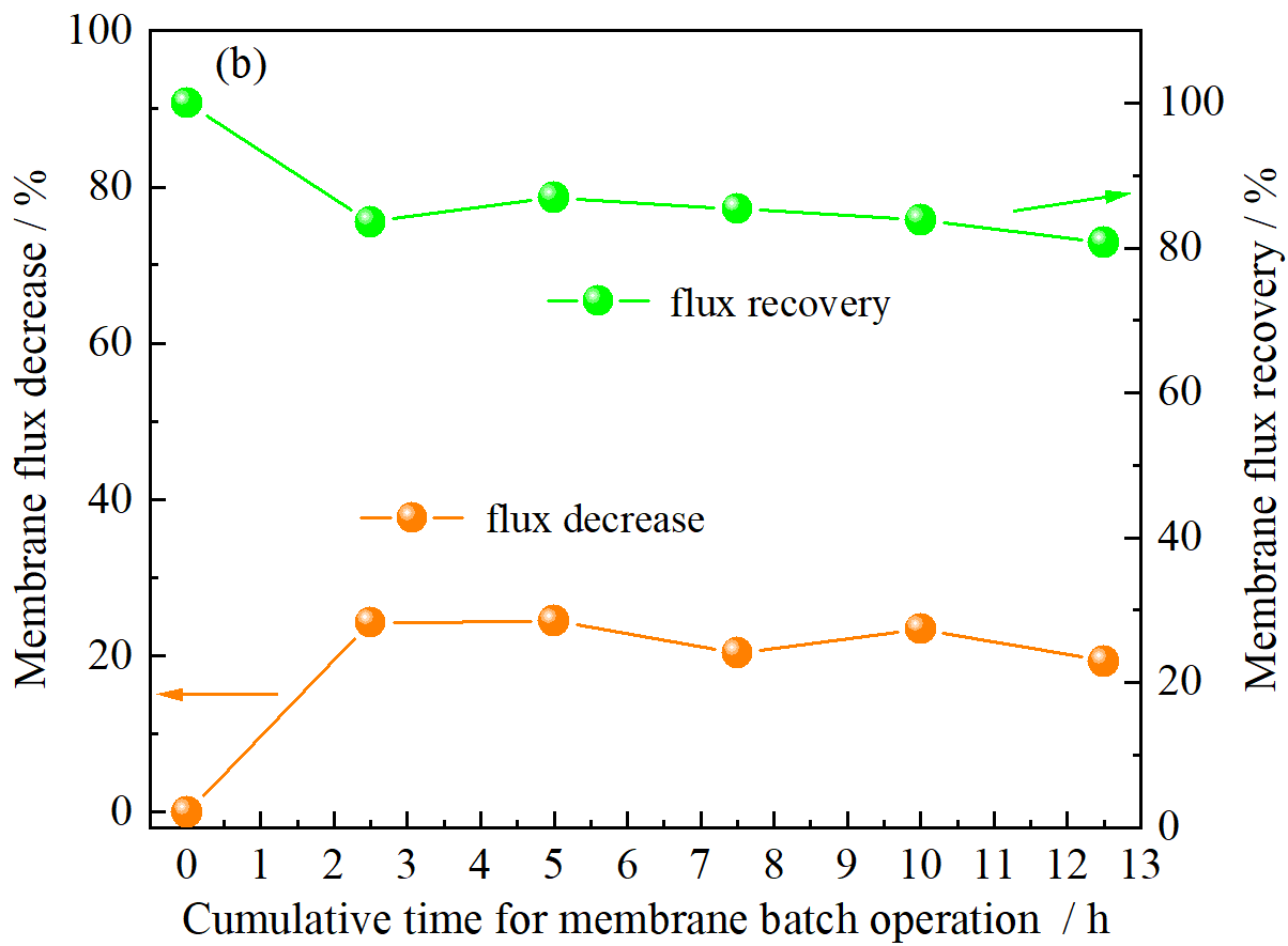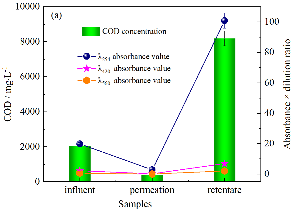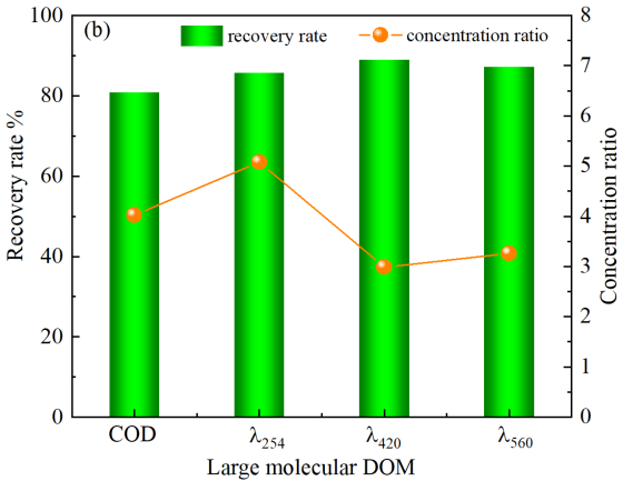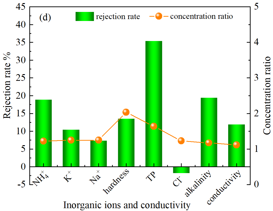 图2显示DUFM对沼液中有机物与无机离子的分离性能。结果表明,DUFM(截留分子量500 Da)能高效截留约80%的化学需氧量(COD)及86-89%的类蛋白/类腐殖质有机物,实现近5倍的浓缩因子。同时,其对NH4+、K+等无机离子的截留率很低(<20%),允许其自由透过,从而实现了有机物与无机盐的初步分离。