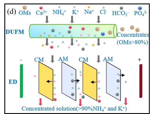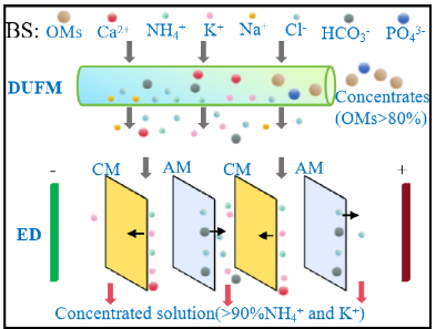 脱色超滤膜(DUFM)作为一种混合荷电膜,在分离有机大分子与无机盐方面展现出独特潜力;电渗析(ED)则是选择性回收无机离子的有效手段。然而,将两者耦合用于沼液养分的分级回收与增值化,此前未见系统研究和工程验证。本研究旨在开发并验证DUFM-ED耦合工艺,以解决沼液处理中组分分离难、膜污染重、能耗高三大痛点,实现从“废物处理”到“资源回收”的战略转变。