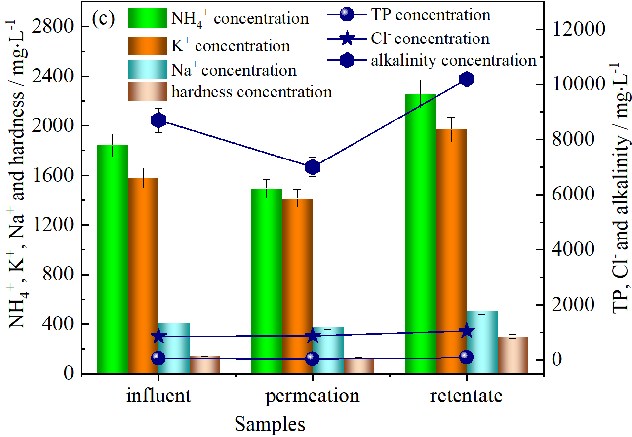 Fig. 2. Separation and recovery of organic matters (OMs) and permeation of inorganic ions from biogas slurry (BS) were conducted using pilot-scale DUFM. The relevant test indicators are as follows: (a) COD concentrations of the influent, permeate and retentate; (b) recovery rate and concentration ratio corresponding to OMs, (c) concentrations of cations (NH4+, K+, hardess(Ca2+)) and anions (TP, Cl-, alkalinity (HCO3-)) across the influent, permeate and retentate; (d) rejection rate and concentration ratio of inorganic ions, together with the measured conductivity.