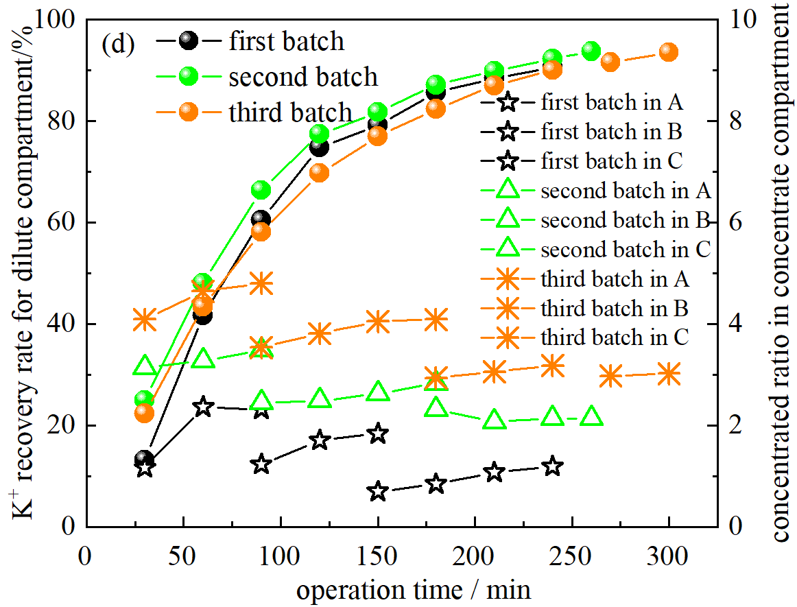 Fig. 5.K+migrationfrom the dilute to concentrate compartments of EDin batch teststreatingDUFMpermeate(a-c);K+recovery rate andconcentration ratio (CR)(d).