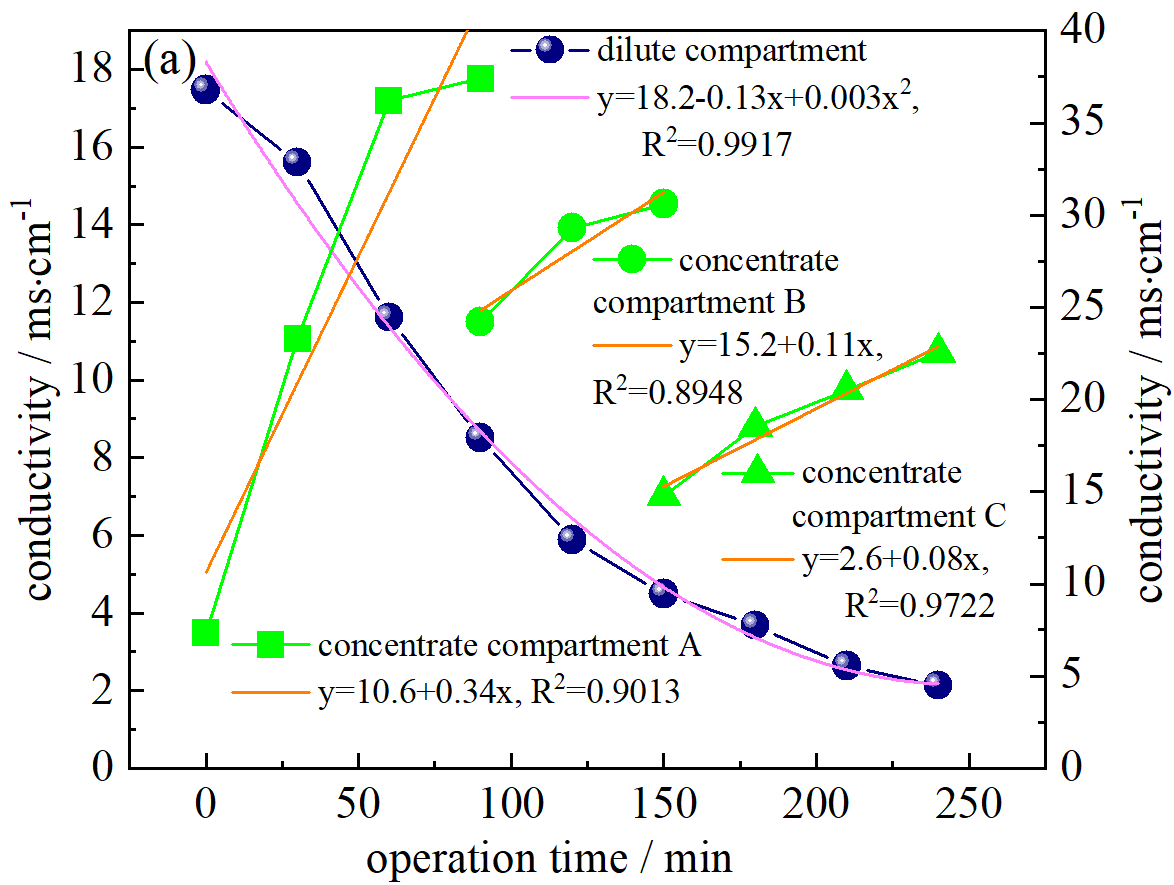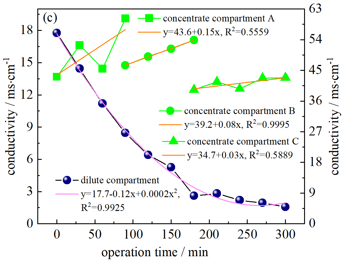 Fig. 3.Conductivitychangesovertimeinthedilute and concentratecompartmentsof EDduringbatch treatmentofDUFMpermeate.(a)-(c) Conductivity variations with time in the dilute compartment and concentrate compartments A, B, and C from the first, second, and third tests, respectively; (d) Separation of OMs and ions from BS by DUFM, and migration of NH4+and K+in ED.