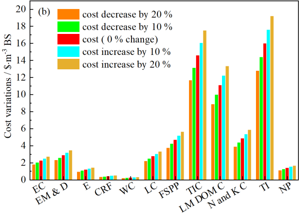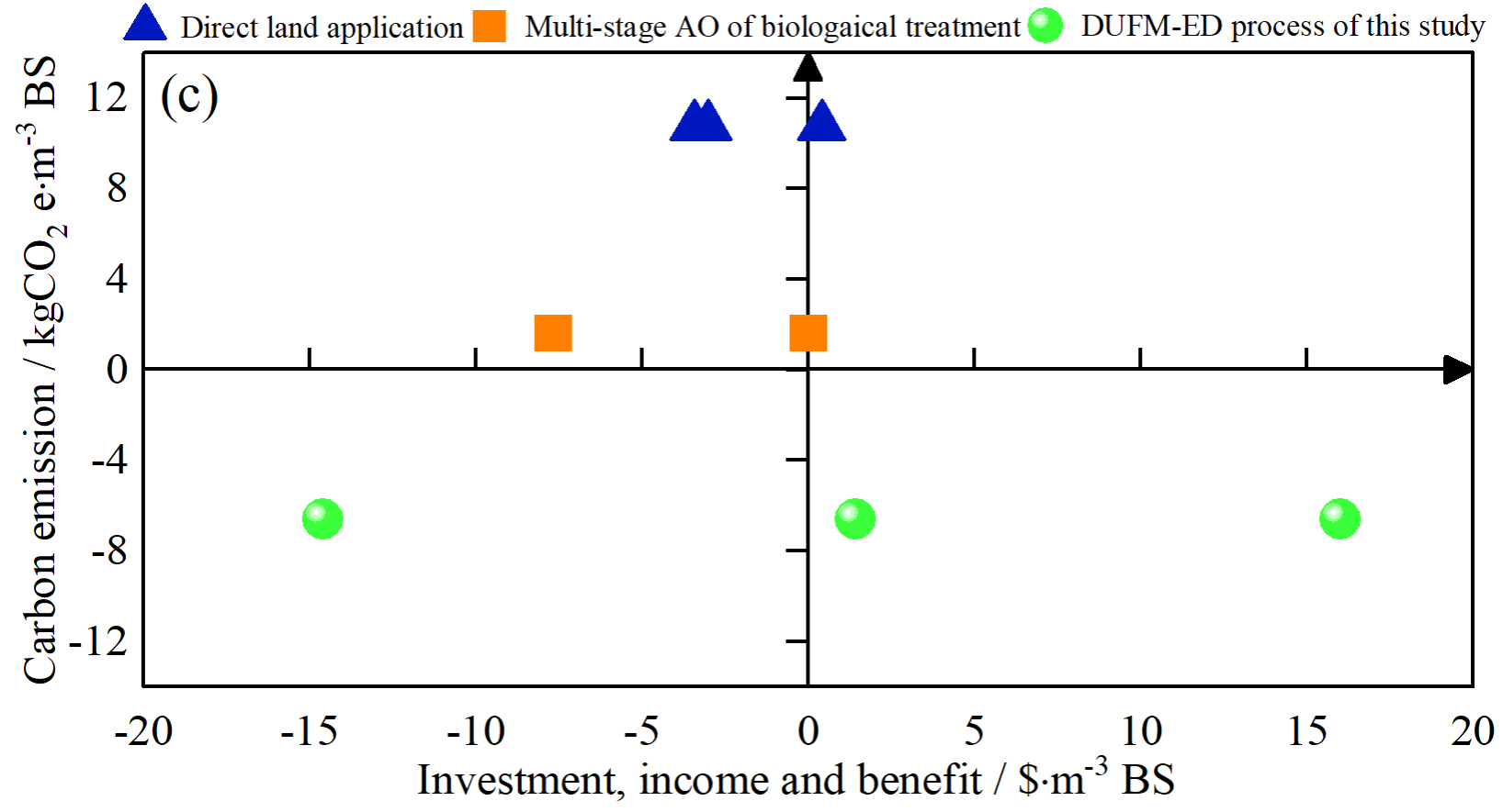Fig. 8.Investment cost and product revenue analysis (a); Economic sensitivity analysis of capital investment and product revenue for the combination process of DUFM and ED (Equipment cost (EC) (b); Equipment maintenance & disposables (EM & D); Electricity (E); Chemical reagent fee (CRF); Water charge (WC); Labor cost (LC); Fee for secondary processing of products (FSPP); Total investment cost (TIC); Large molecular DOM concentrates (LM DOM C); NH4+and K+concentrates (N and K C); Total income (TI); Net profit (NF)), Economic benefit and carbon reduction of fractional grading process for BS nutrient recovery vs. direct land application and multi-stage anaerobic/oxic (AO) biochemical treatment (c); and Funan, China engineering project for BS nutrient recovery via fractional grading progress (including DUFM and ED) (d).