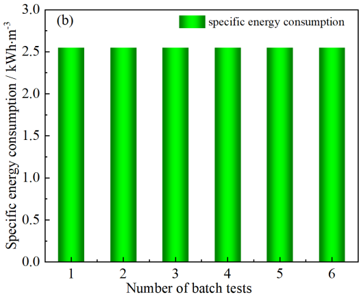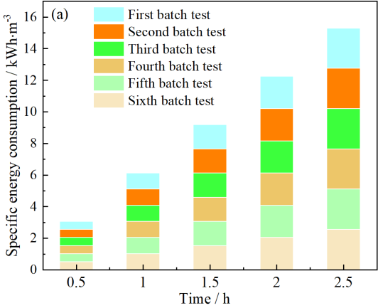 图7说明工艺能耗分析。整个DUFM-ED耦合工艺的综合能耗为8.7 kWh·m-3,其中DUFM单元占29.3%,ED单元占70.7%。该能耗较传统的超滤-反渗透(UF-RO)工艺降低了58-72%,体现了显著的节能优势。