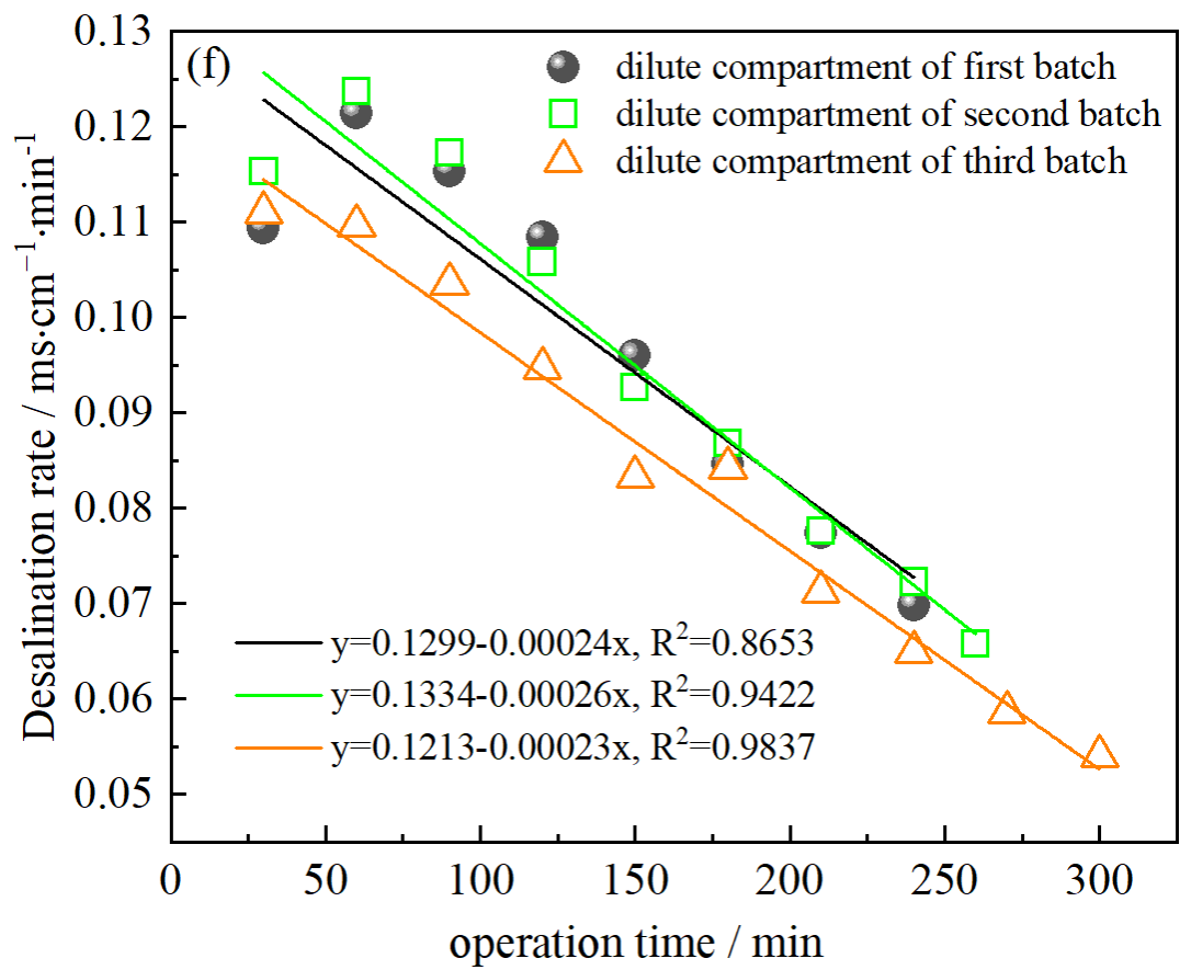 Fig. 6.Membrane fluxineach batch test of 5 m3rawBS in the DUFMunder 5-7 bar operating pressure (a); Membrane flux decline (FD) and flux recovery (FR) (b); Transfer rates of NH4+, K+and their total concentration, and current efficiency (CE) (c-e);anddesalination rate (DR) in the ED compartment over time(f).