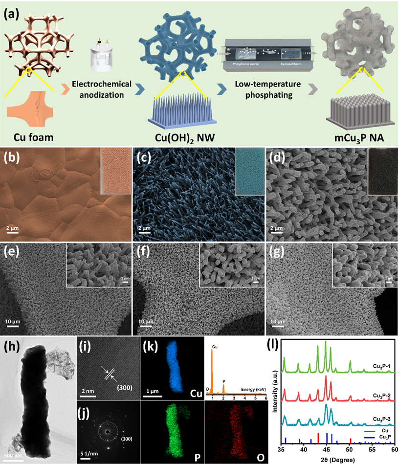 过渡金属磷化物,尤其是磷化亚铜(Cu3P),因其独特的电子结构、优异的比容量、良好的氧化还原可逆性及较低的氧化还原电位,在电化学储能与转换领域展现出广阔的应用前景。尽管Cu3P在阴离子可逆储存方面表现出显著潜力,但其在EDI体系中的应用尚未见报道,且其反应动力学和结构稳定性仍需进一步提升以满足实际应用需求。