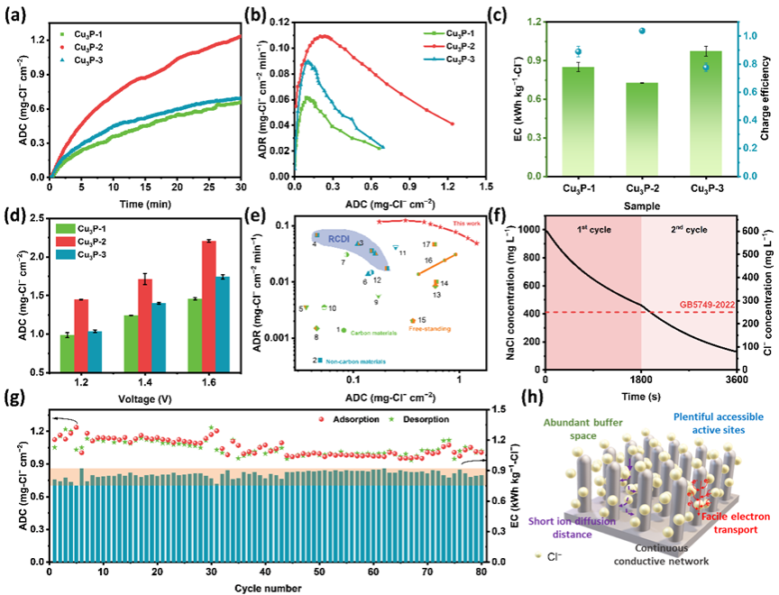 低曲折度Cu3P纳米棒阵列在电化学除氯中展现出优异的面积性能。在1.6V的恒定电压下,Cu3P-2的面积去离子容量达到2.21mg-Cl−cm−2,相对应的面积去离子速率高达 0.074 mg-Cl−cm−2min−1。显然,mCu3P NA表现出比任何其他Cl−存储电极材料(甚至高负载电极)更高的面积去离子容量和面积去离子速率。此外,经过80次循环后,容量保持率接近90%,且材料结构完整无坍塌,表现出优异的长期稳定性。这些优势使得mCu3P NA在电化学除氯应用中具有显著的竞争力,尤其适用于空间受限的高效去离子设备。