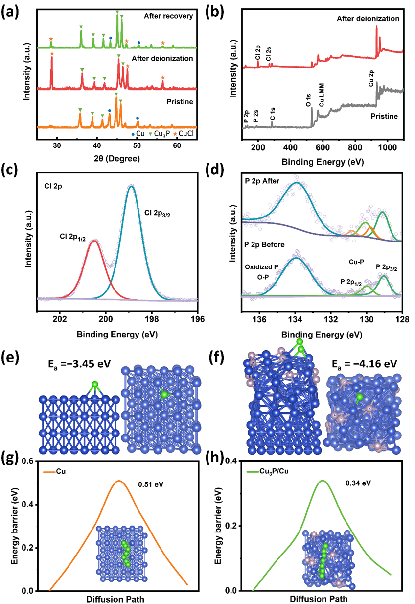 基于XRD和XPS表征结构,首次提出了Cu3P捕获Cl−的机理,其与P3−/P0的氧化还原和CuCl的形成有关。DFT模拟则进一步分析了可控磷化对性能的影响机理,磷化程度通过调节Cu3P/Cu异质结构的阵列结构和组分,从而影响面积去离子性能。