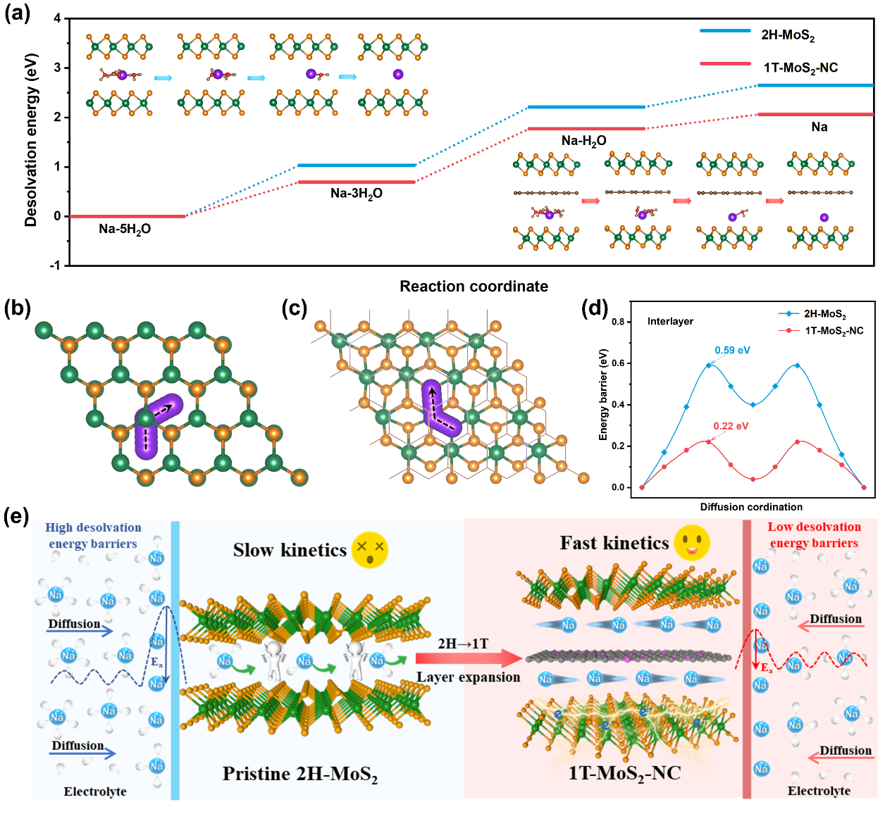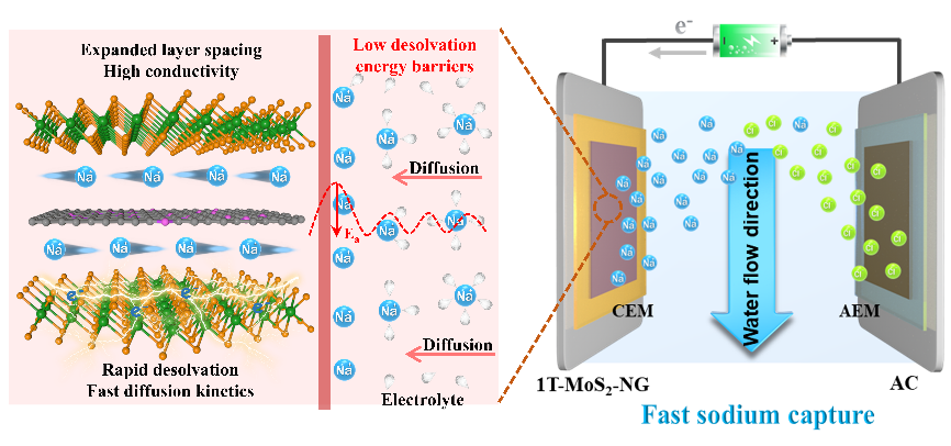 电化学Na+捕获被认为是大规模储能和微咸水净化系统的有前途的候选者。在水溶液中,钠离子通常以水合离子(Na(H₂O)x⁺,其中x的取值范围为0 ~ 5)的形式存在,其半径为2.4 ~ 2.5 Å,明显大于未水合的Na⁺(0.98 ~ 1.07 Å)。如此大的水合离子半径增大了Na+从电解质到电极内部的扩散屏障,导致存储动力学缓慢。因此,Na(H₂O)x⁺的脱溶被认为是决定电化学过程动力学的主要步骤。在脱盐过程中,不可逆的水嵌入会占据活性位点,降低Na+的存储容量,水分子的高极性会导致严重的结构降解和容量衰减。作为一种典型的层状过渡金属硫化物(TMS),具有石墨状结构的MoS2由于其丰富的活性位点和独特的层状结构而备受青睐。然而,由于不可逆的结构演变和层间距不足,MoS2表现出较差的循环稳定性和有限的离子传输速率,严重阻碍了其商业应用。值得注意的是,所有这些挑战都直接或间接地与电极/电解质界面的离子脱溶过程有关。因此,设计具有调节溶剂化行为的MoS2电极材料对于高性能钠离子存储至关重要。有鉴于此,同济大学马杰教授、李新贵教授和上海海洋大学于飞教授合作,采用电子组态调制和分子插层的双结构工程策略,制备得到了具有脱溶调控的氮掺杂层状碳插层的1T-MoS2超晶格纳米花电极。该材料展现了高容量、快速率、低能耗以及优异循环稳定性的盐离子去除性能。该研究揭示了脱溶调节对钠离子存储的促进作用,为先进的电化学水溶液离子存储应用铺平了道路。