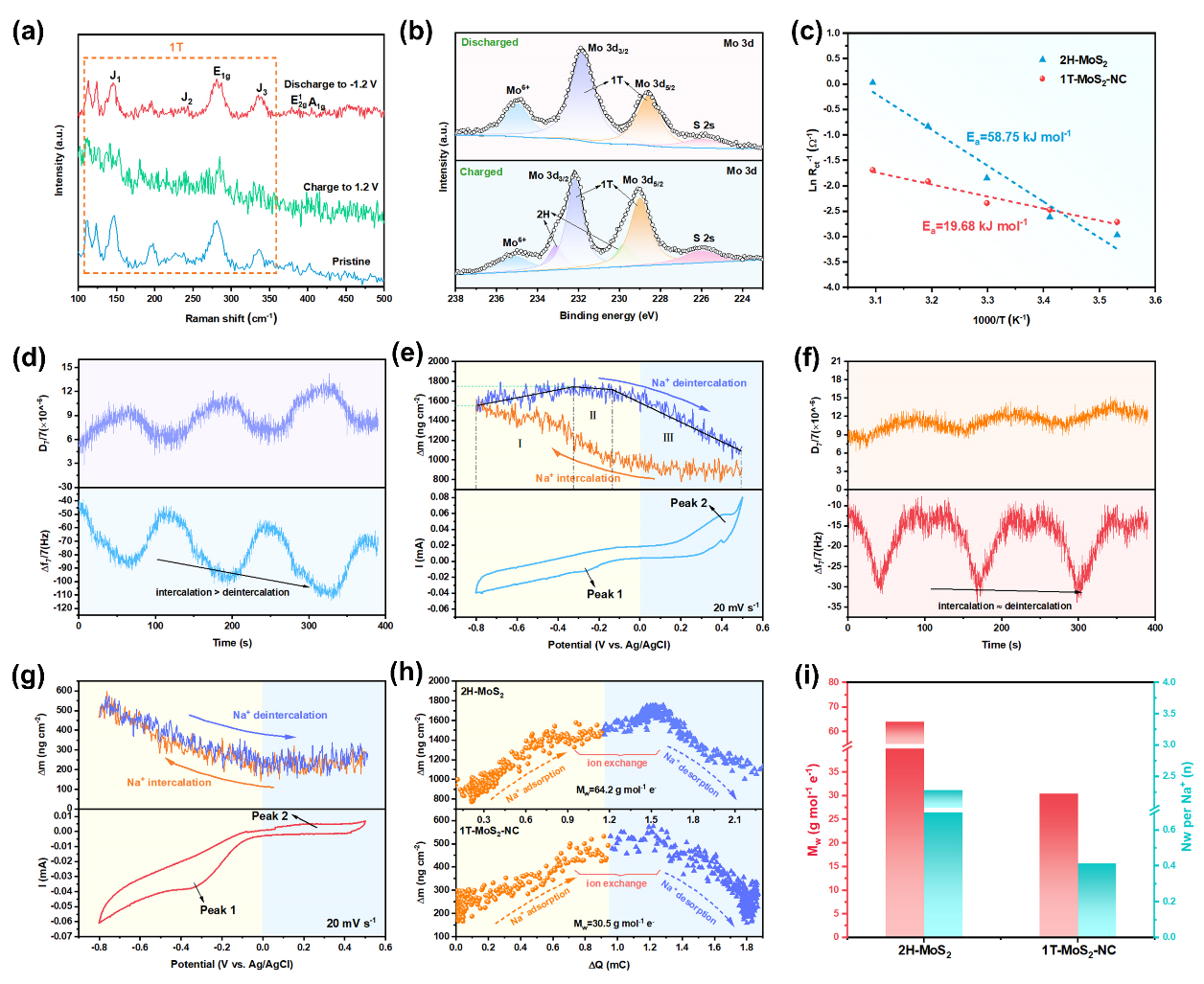 异位Raman和XPS测试表明,1T-MoS2-NC在充放电过程中会由1T相转变为2H相,最终变为1T相,表现出高度可逆的Na+插层/脱嵌特性。基于阿伦尼乌斯方程计算得到1T-MoS2-NC的脱溶能为19.68 kJ mol-1,远小于2H-MoS2的58.75 kJ mol-1。此外,EQCM测试也证明了1T-MoS2-NC具有更强的去溶剂化能力,这主要归因于阳离子-π相互作用和空间位阻效应。