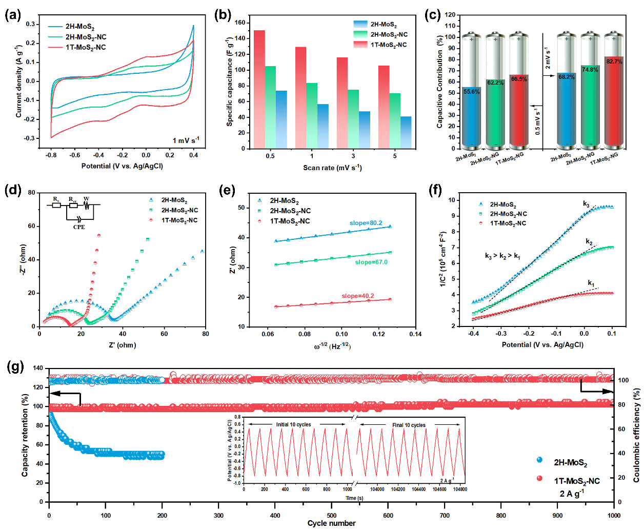 电化学测试表明,1T-MoS2-NC电极展现了更高的电化学容量和优异的循环稳定性、更低的内阻和界面转移电阻以及更高的电荷载流子浓度。