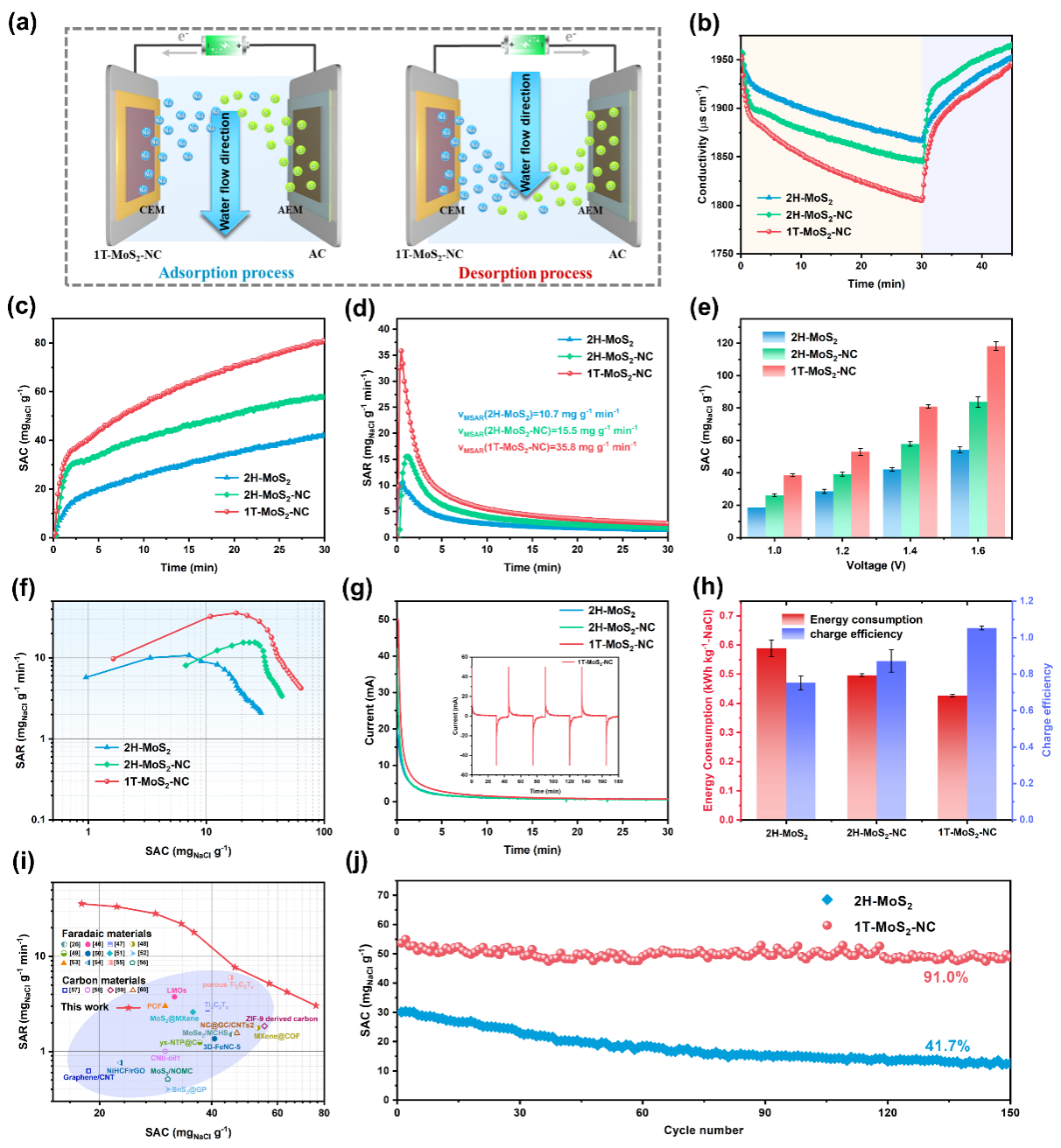 脱盐测试表明,1T-MoS2-NC电极展现了80.9mg g-1的脱盐容量、2.7mgg-1min-1的平均脱盐速率,0.43 kWh kg-1-NaCl的低能耗, 150次循环后的容量保持率可达91.0%,远高于2H-MoS2(41.7%)。这些结果有力地证明了1T-MoS2-NC在CDI应用中具有稳定、高效和低能耗的优势。