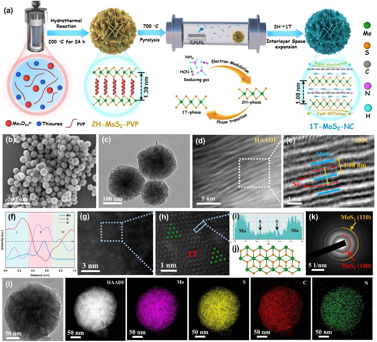 本研究采用溶剂热法和高温碳化,以三聚氰胺为还原剂,通过分子插层和电子注入制备得到了具有1T相和层间距扩展的MoS2超晶格纳米花电极。相关分析测试表明,1T-MoS2-NC具有丰富的1T相三角形晶格区且层间距扩展为1.08 nm。