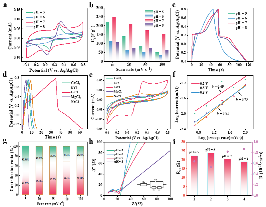 Figure 4.(a) Cyclic voltammograms for different LFP@C-7 at scan rate of 50 mV s-1. (b)Gravimetricspecific capacitances of LFP@C-7 at different scan rates. (c) GCD profiles of the LFP@C-7 at the current density of 50 mA g-1. (d) GCD profiles of LFP@C-7 in different salt solutions at the current density of 50 mA g-1.(e) CV curves of LFP@C-7 in different salt solutions at scan rate of 50 mV s-1. (f) Calculation of b-values based on CV curves.Normalized contribution ratio of capacitive capacitance at different scan rates (g). (h, i) Nyquist plots, Rctand Diffusion coefficient of different samples.