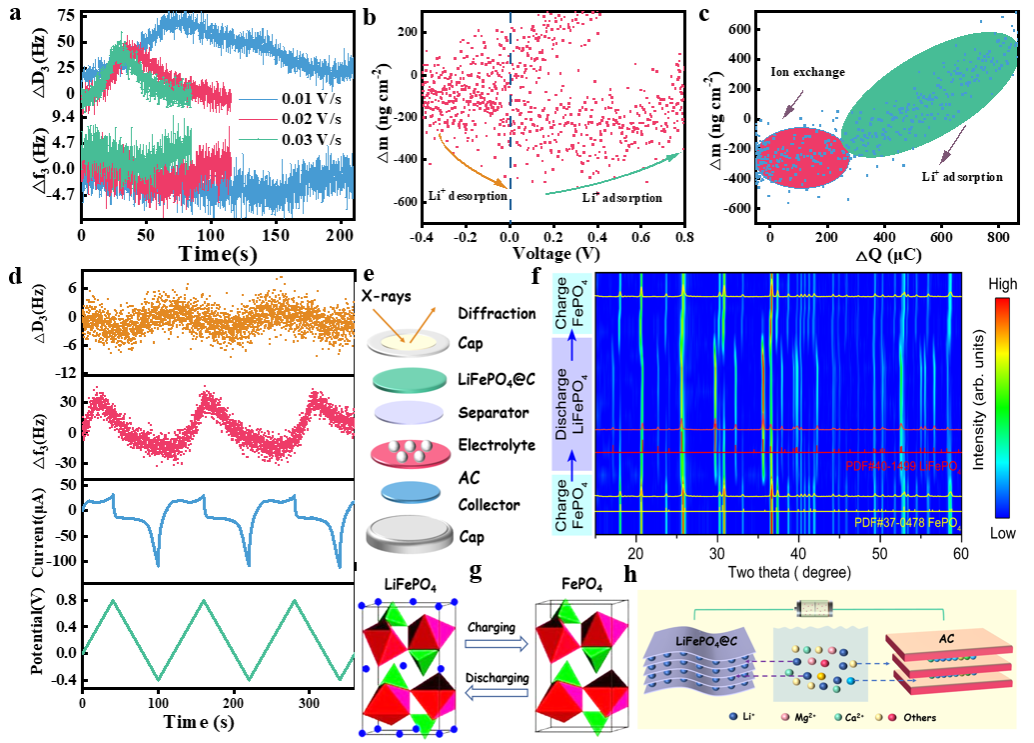 Figure 6.Mechanistic analysis.(a)Δf3/3 and ΔD3ofLFP@C-7 versus time at various scan rates during the 2nd CV cycle tested via EQCM.(b)The mass change of LFP@C-7 at the scan rate of 30 mV s-1.(c) LFP@C-7electrode mass versus charge passed during reduction at 30 mV s-1from EQCM-D.(d)Δf3andΔD3responses ofLFP@C-7from EQCM-D during CV at the scan rate of30 mV s-1in 0.01 MLiCl.(e)Schematic diagrams of the customized cell for in situ XRD measurements. (f) In situ XRD patterns of the LFP@C-7//AC cell during desalination/regeneration process. (g)Physical phase changes of LFP@C-7 during Li+embedding and removal processes. (h)Mechanism diagram of LFP@C-7//AC selective Li+extraction.