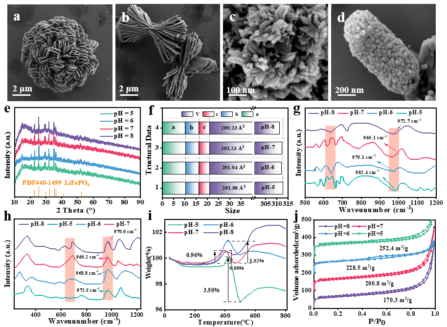 Figure 3.SEM (a: LFP@C-5, b: LFP@C-6, c: LFP@C-7, d:LFP@C-8). (e) XRD pattern of the LFP@C-7. (f)Main structural data of the LFP samples. (g)FTIR and Raman spectra (h) of LFP@C. (i) LFP Thermogravimetric tests (TGA) of LFP@C. (j)N2adsorption/desorption isotherm curves of LFP@C.