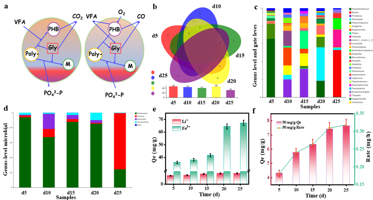 Figure 2.(a) Mechanistic diagram of phosphorus uptake and release by thepolyphosphorusbacteria. (b) Genus-level microbial community structure at different time points.Microbial community structure at the genus level (c) and phylum level (d) during different acclimation periods.(e) Changes in the adsorption capacity of strains for Fe3+and Li+. (f) Changes in capacity and rate of PO43-adsorption by strains at different stages of domestication.