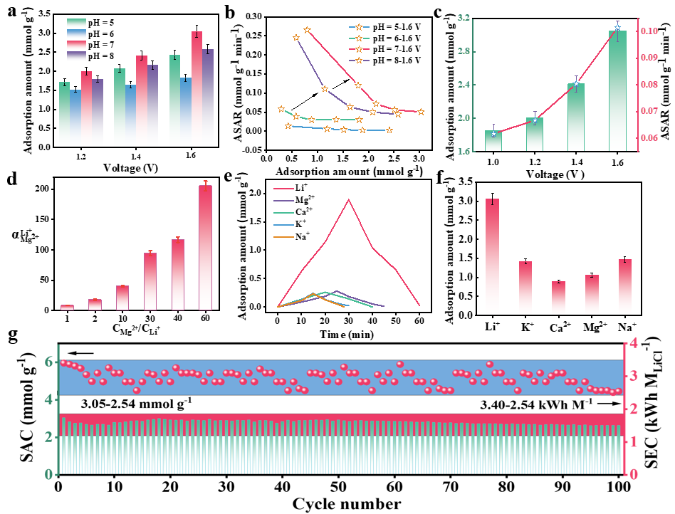 图5显示了不同样品在不同截止电压(1.20~1.60 V)和1000mg L−1LiCl溶液中的Li+分离性能。在不同截止电压下,LFP@C-7的分离容量最高,其次是LFP@C-8,这与样品的形态、比表面积的大小和活性物质的含量密切相关。为了评估不同电极在1.60 V截止电压下的性能,绘制了Kim-Yoon图来比较吸附容量与平均Li+吸附速率(ASAR)之间的关系。与其他三种电极相比,LFP@C-7的吸附容量和ASAR皆最大。使用雷达图对不同样品的比容量、ASAR、容量保持率、D和Li+提取能力进行的综合评估,发现LFP@C-7的性能最佳,因此可用于后续研究。在1.00~1.60 V的截止电压范围内(不考虑水分解),进一步考察了LFP@C-7的Li+吸附容量和ASAR,可发现吸附容量和ASAR都随着截止电压的增加而逐渐增加,在1.6 V时达到了3.05mol g-1的最大吸附容量和0.1mmol g-1min-1的最大ASAR。