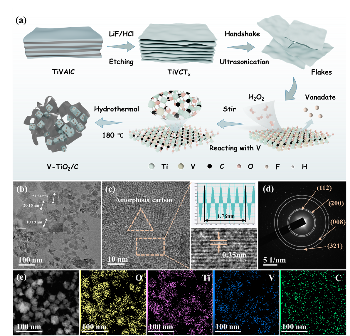 纳米约束技术是制备异质结构或结构稳定的纳米材料的有效方法。选择合适的前驱体作为纳米空间模板生长目标材料,最终实现一步制备杂化结构是解决上述问题的有效策略。MXene的层状结构提供了理想的二维纳米受限空间,为制备具有传统金属前驱体无法获得的特殊结构的金属氧化物和硫化物提供了理想的平台。TiVCTx是一种双过渡金属MXene,其中Ti和V原子随机分布在同一金属层内,通过调整金属层中V原子的数量,可以在二维层状纳米约束空间内构建三维亚纳米级约束结构,促进TiO2生长,有望实现TiO2晶粒的精确尺寸调节和形貌优化,同时实现V掺杂和C复合材料的双重改性。然而,相关报道很少。