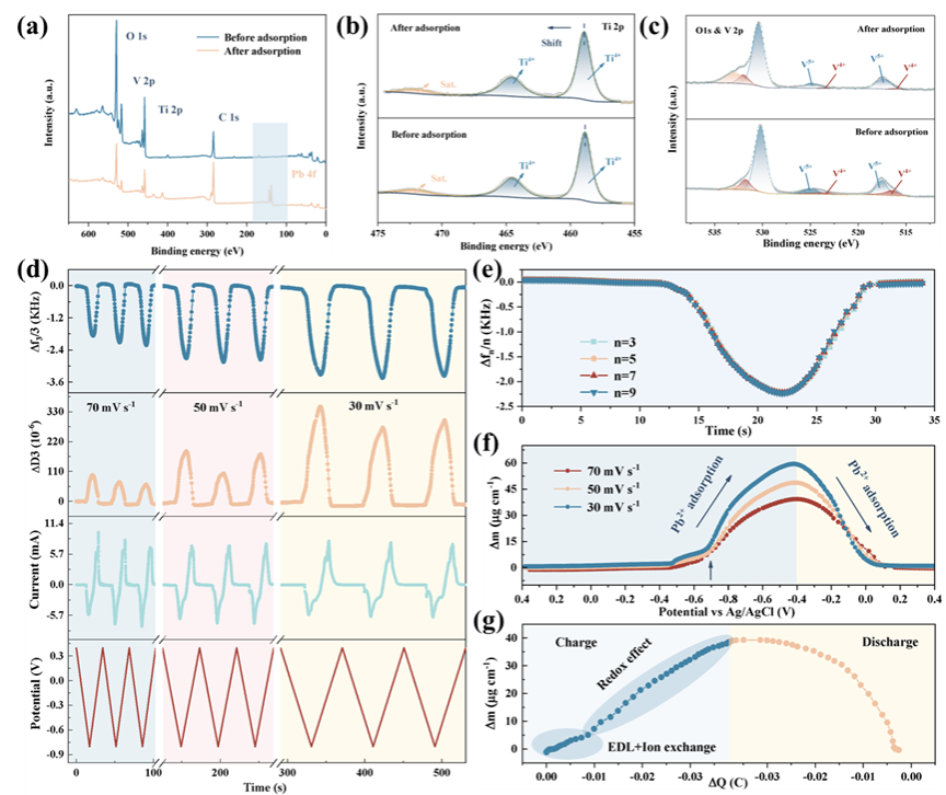 Fig. 5. (a) Comparison of XPS full spectra before and after adsorption of Pb2+at V-TiO2/C-0.5 electrode; (b) comparison of Ti 2p spectra before and after adsorption of Pb2+at V-TiO2/C-0.5 electrode; (c) comparison of O 1s & V 2p spectra before and after adsorption of Pb2+at V-TiO2/C-0.5 electrode; (d) Δf3/3, D3 and current responses of V-TiO2/C-0.5; (e) variation of normalized frequency of V-TiO2/C-0.5 with different overtone steps at a scan rate of 0.07 V s-1; (f) variation of V-TiO2/C-0.5 quality with scanning voltage at different scanning rates; (g) the mass change versus power change curves of V-TiO2/C-0.5 were calculated by the Sauerbrey equation.