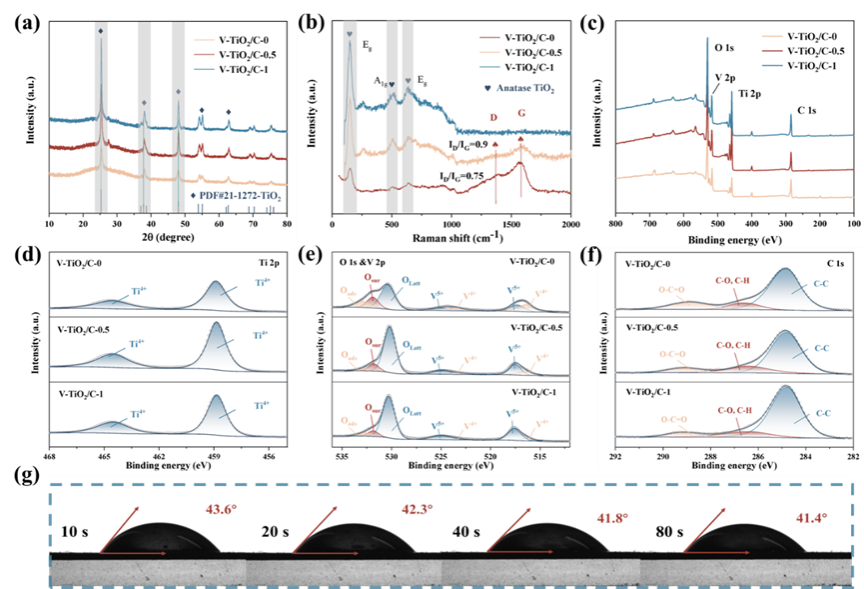 Fig. 2. Comparison of (a) XRD spectra and (b) Raman spectra of V-TiO2/C-x; (c) XPS full spectrum comparison of V-TiO2/C-x; comparison of (d) Ti 2p, (e) O1s&V2p, and (f) C1s XPS fine spectra of V-TiO2/C-x; (g) Water contact angle versus time for V-TiO2/C-0.5.