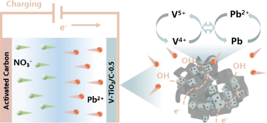 利用电容去离子技术选择性去除水中重金属离子是一种新颖而有吸引力的净水方法。在电容去离子研究领域,电极材料是这种选择性去除技术的关键。过渡金属氧化物由于具有较高的理论赝电容和适中的成本而受到特别关注不同晶相的TiO2具有成本低、无毒、易于合成和电化学稳定性高等优点,受到了广泛的研究。然而,开发具有前景的TiO2电极必须解决几个限制因素,主要包括差的电子导电性和低离子扩散率。为了解决这些问题,一种有效的方法是将TiO2纳米颗粒限制在碳质材料中,另一种有效的方法是元素掺杂,其中由掺杂氧空位产生的缺陷有利于增加电导率和活性吸附位点。然而,大部分工作需要复杂的多步合成过程,并且TiO2与碳之间的内部键合较弱,导致对目标离子的吸附能力相对较低。
