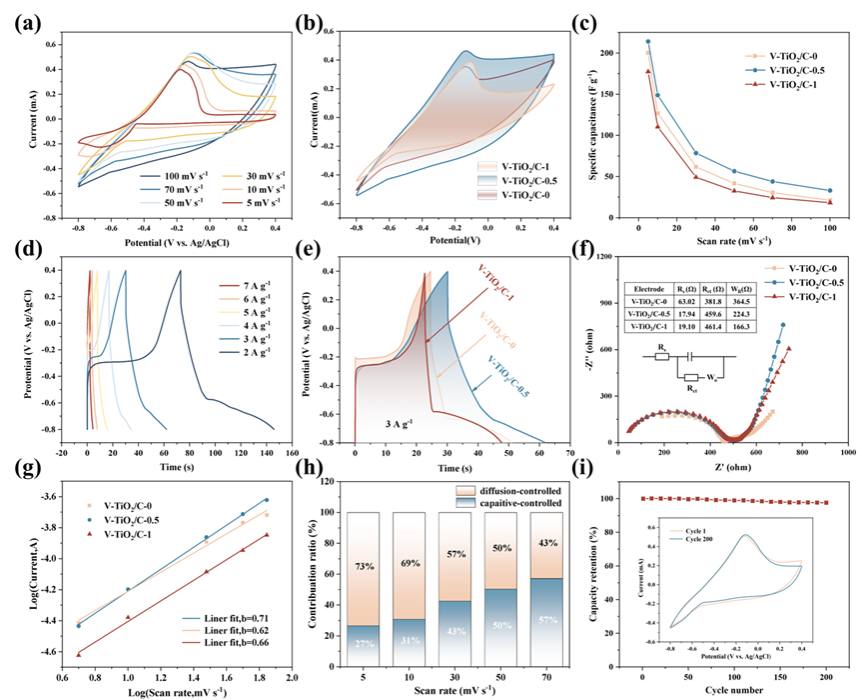 Fig. 3. (a) CV curves of V-TiO2/C-0.5; (b) V-TiO2/C-x CV curves at a scan rate of 50 mV s-1; (c) specific capacitance of V-TiO2/C-x with different scan rates; (d) GCD curves of V-TiO2/C-0.5 at different current densities; (e) comparison of GCD curves of V-TiO2/C-x at 3 A g-1 current density; (f) Nyquist plots of V-TiO2/C-x (The inset shows the equivalent circuit diagram and fitted data); (g) the logarithmic plots of current and scan rate comparison of V-TiO2/C-x; (h) capacitive and diffusion-controlled contributions of V-TiO2/C-x at different scan rates; (i) capacity retention of V-TiO2/C-0.5 after 200 CV tests.